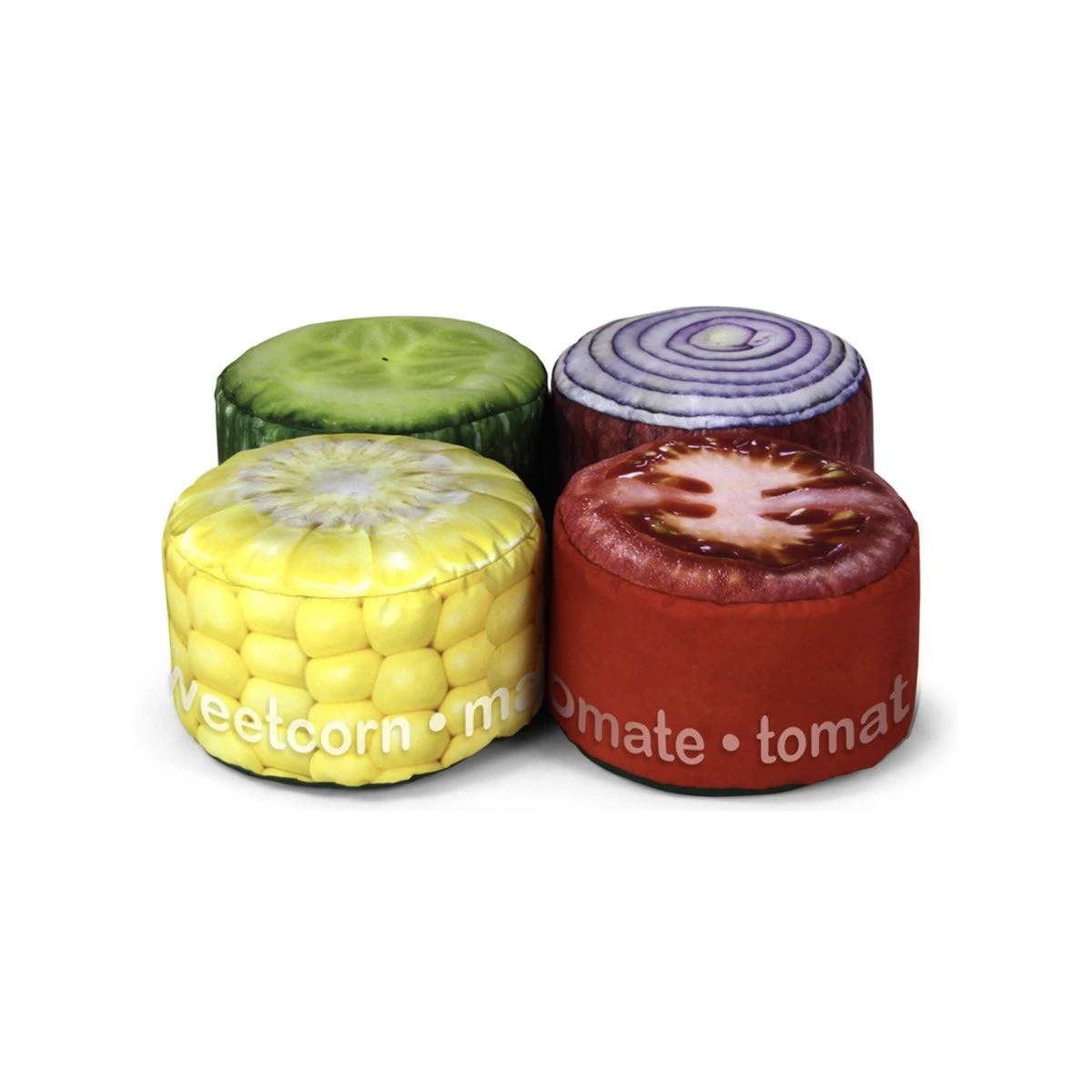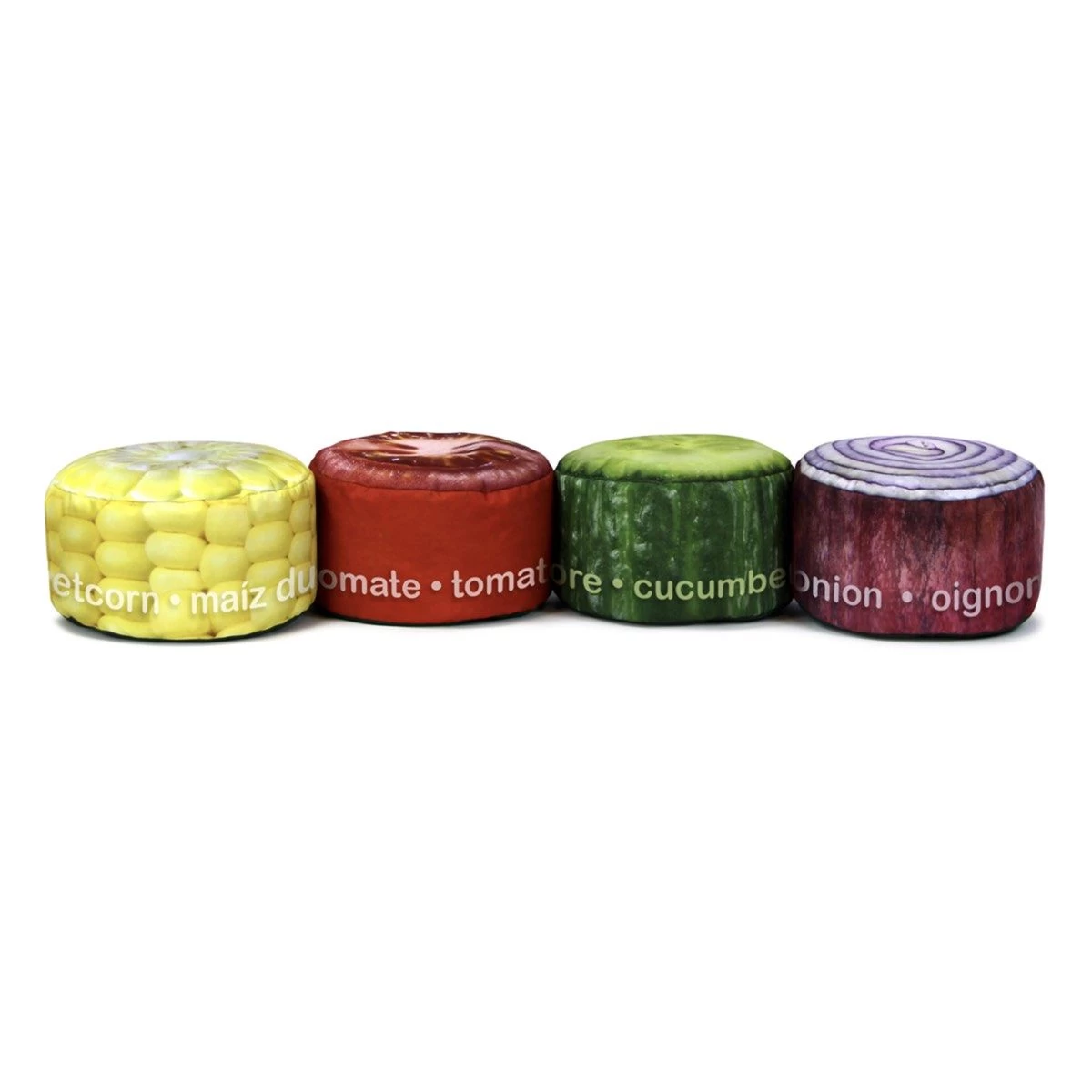 The Mini Vegetable Stool Set is printed with the name of the veg in English, French and Spanish.